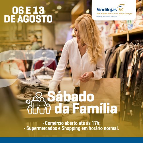 Sábado dia 08/06 tem mais uma edição do SÁBADO DA FAMÍLIA, aproveite para fazer as suas compras, o comércio de São Bento do Sul estará atendendo até às 17:00 horas.