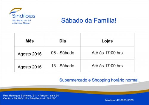 05/07/2013Sábado dia 06/07 tem mais uma edição do SÁBADO DA FAMÍLIA, aproveite para fazer as suas compras, o comércio de São Bento do Sul estará atendendo até às 17:00 horas.