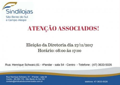22/11/2017Devido a falta de quorum de 50% mais um na primeira convocação da Eleição que ocorreu no dia 20 de novembro de 2017, conforme Edital de Convocação nº 05/2017, segue nova data para a Eleição desta Entidade.